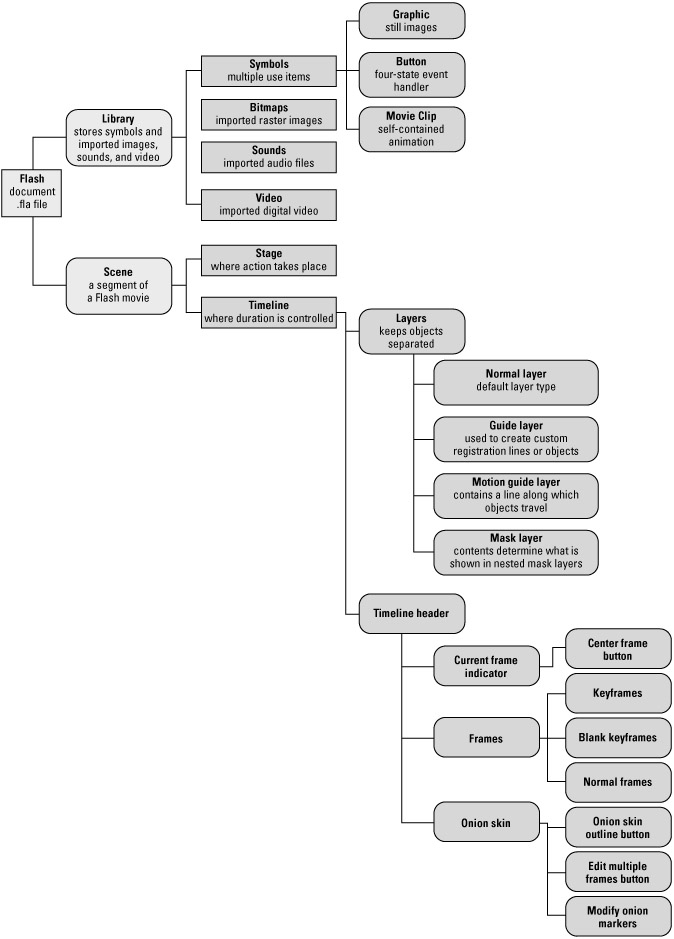 Flash document files (.fla) are architected to provide an efficient authoring environment for projects of all sizes. Within this environment, content can be organized into scenes, and the ordering of scenes can be rearranged throughout the production cycle. Layers provide easy separation of graphics within each scene, and, as Guide or Mask layers, they can also aid drawing or even provide special effects. The Timeline shows keyframes, motion and shape tweens, labels, and comments. The Library (which can be shared amongst movies at authortime or at run time) stores all the symbols in your project, such as graphics, fonts, animated elements, sounds or video, and components.