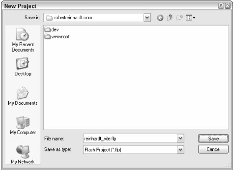 In the New Project dialog box, browse to the robertreinhardt.com folder on your computer. Save a new project file named reinhardt_site.flp in this location, as shown in Figure 3-7.