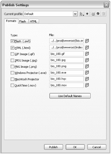 With bio_100.fla open, take a look at how the bio.swf file (located in the wwwroot folder) is published. Choose File ð Publish Settings. In the Formats tab, notice that relative paths are declared for the bio.swf and index.html files (see Figure 3-15) in the Flash and HTML fields, respectively. The ../../prod/wwwroot/ prefix tells Flash 8 to publish these files two folders above the fla folder, inside of the prod/wwwroot folder. Click Cancel to close the dialog box. Leave bio_100.fla open for the next series of steps in the following section.