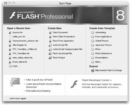 By default, the Start Page should appear when you first launch Flash and any time you close all Document windows while the program is running. After you have opened or created a new file, the Start Page automatically closes to make room on your desktop. If you prefer not to use the Start Page, select the Don't show again check box at the bottom of the panel, or change the settings for On launch in General Flash Preferences (Edit ð Preferences or Flash ð Preferences). This leaves you with the more limited, but familiar, option of using the application File menu (or shortcut keys) to create and open files.