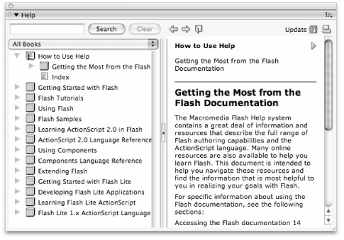 The Flash Help menu is your gateway to local versions of the documentation and examples on Macromedia's support site. The tabbed interface introduced in Flash MX 2004 has been dropped in favor of a centralized list. Rather than clicking back and forth between two different Help modes, you can now browse or search a listing of available Help topics and use the new drop-down menu to choose the "books," or categories of Help content, you want to view. An accordion divider separates the main reference content from the table of contents (or book listings) that will expand or collapse to show sublistings as you use the control icons at the top of the panel. You can also navigate books and subcategories using the expand and collapse arrows on the left edge of the book list. To adjust the division of the book list and the content area (shown in Figure 4-2), simply hover over the dividing line until you see a dual arrow cursor; then drag the divider until you're happy with the panel split.