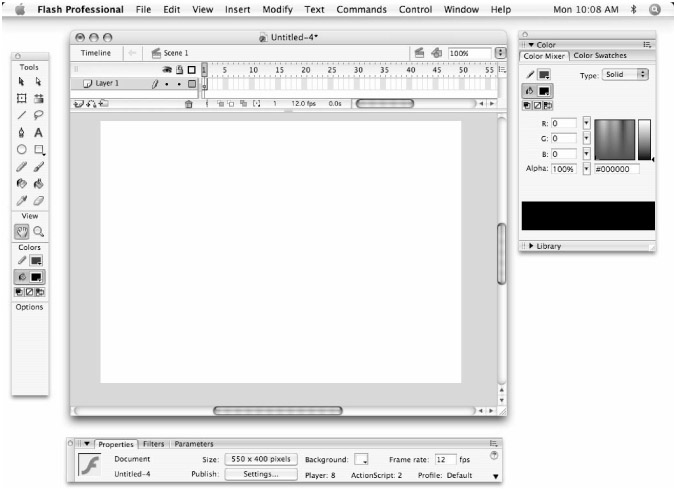 Figure 4-3 shows how the default layout (Window ð Workspace Layouts ð Default) looks on the Mac. Figure 4-4 shows how the same panel set looks on Windows with the Professional version of Flash 8.