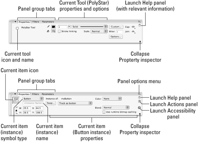 The top figure shows the Property inspector (collapsed), as it appears when the PolyStar tool is active (selected in the Tools panel) — displaying Stroke and Fill colors and options, buttons for launching Settings dialog boxes for line styles and tool options, and the icon for launching the Help panel. The bottom figure shows the Property inspector (expanded), as it appears when a Button symbol instance is selected on the Stage — displaying instance properties and options. The launcher icon for the Help panel is still available, and icons for launching the Actions panel and the Accessibility panel are also visible when the Property inspector is expanded.