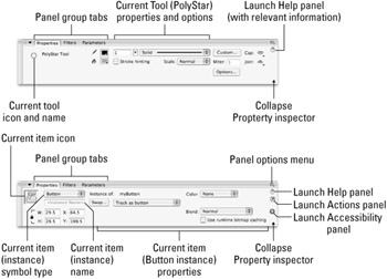 The Property inspector is a centralized place to access most common options for various authoring items. You can select or modify many options directly in the Property inspector, but for some items, buttons appear that you can use to launch additional menus or dialog boxes. Generally, you will only need to access separate panels for a few specialized editing tasks. Figure 4-5 shows how the Property inspector changes to display options relevant to the currently selected item.