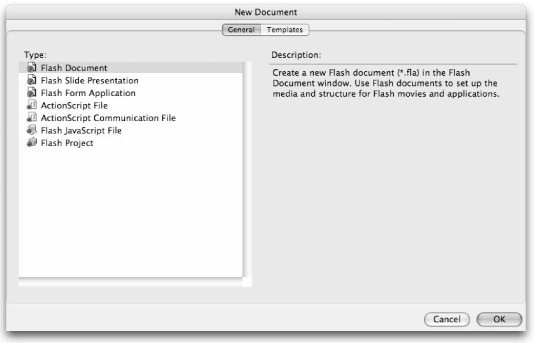 Figure 4-15 shows the New Document dialog box for Flash Professional 8. The dialog box includes a General tab for opening Flash documents and a Templates tab for opening Flash documents with prebuilt elements that you can use as guides for designing specific kinds of presentations.