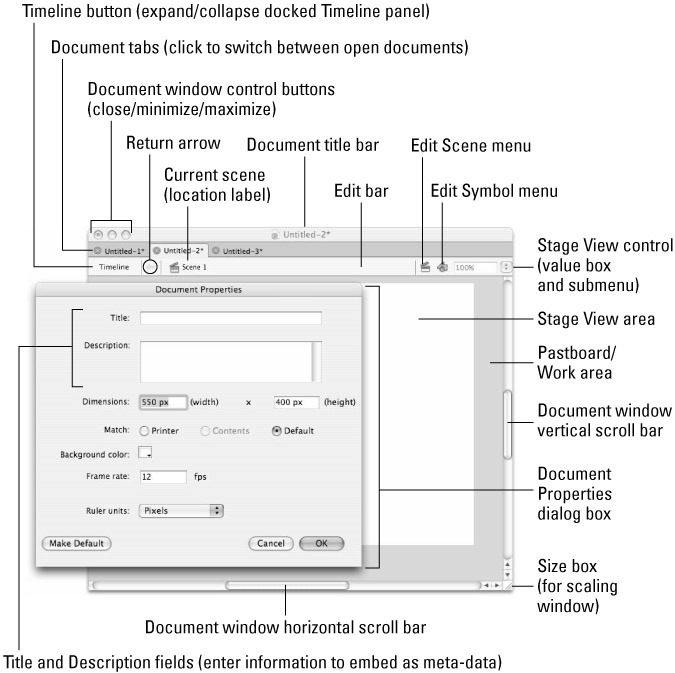 The Document window is the work table of your Flash project. This window tells you what document (.fla) is currently active and shows you where you are working in the project. When you open or create a new Flash file, a new Document window appears on the screen. You can have multiple files open simultaneously — click to move from one Document window to another. You have the option of choosing a document type from the Start Page (discussed earlier in this chapter; shown in Figure 4-1) or from the New Document dialog box invoked by the New File command: File ð New (Ctrl+N or z+N).