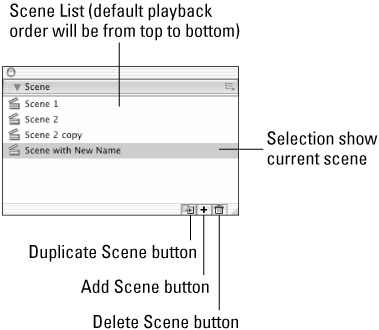 To rearrange scene order, simply click and drag a scene to alter its position in the Scene panel list. You can use actions to direct the movie to access scenes outside the default linear order. For more about actions, refer to Chapter 18, "Understanding Actions and Event Handlers."