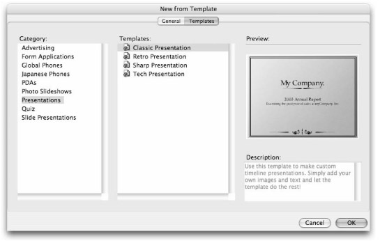 The library of predefined Flash documents available in the Templates tab of the New Document dialog box (or in the Create from Template list of the Start Page) is a great starting point for creating many common Flash presentations. The templates shown in Figure 4-18 are listed in both Flash Basic and Flash Professional, but some of the templates can only be used in the pro version of the program.