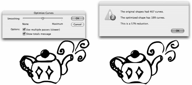 The most powerful tool for optimizing artwork precisely is found in the Optimize Curves dialog box invoked by choosing Modify ð Shape ð Optimize. This feature gives you a slider control to set the amount of smoothing applied between None and Maximum. You can also choose to apply optimization repeatedly for greater reduction in points. Selecting the Use multiple passes check box repeats the smoothing process until no further optimization can be achieved. The totals message notifies you how many points have been removed and what percentage reduction has been achieved each time you apply the modification. Figure 5-32 shows a sketch drawn with the Pencil tool in Ink mode before and after multiple passes of Optimize Curves are applied. The reduction in points is displayed in the dialog box. For illustration purposes, we made a drastic adjustment by applying Optimize Curves set at Maximum. For practical purposes, you should find a balance between optimization and drawing complexity by testing a range of settings.