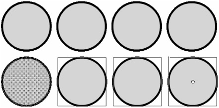 Figure 5-33 shows a shape, a Drawing Object, a group, and a symbol as they look when unselected (top) and as they appear when selected with the Selection tool. The first oval (a primitive shape), displays a mesh pattern when selected (left), whereas the second oval (drawn with the Object Drawing option turned on) and third oval (with the stroke and fill combined in a group) display a thin rectangular border when selected (center), and the final oval (which was converted into a Graphic symbol) displays a thin rectangular border with a small crosshair icon in the top-left corner and a white transformation point in the center when selected (right). You can move groups and symbols but not edit them directly on the Stage with the Selection tool unless you go into Edit mode.