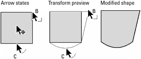 Figure 5-35 shows a series of (magnified) images that demonstrate the various arrow states as they appear and are applied. On the left, the original shape is shown with the arrow states displayed as the cursor is moved over the center of the shape, over a corner (B), and over a line (C). The center image shows the preview as the Reshape Corner arrow is used to extend the corner of the square and the Reshape Curve arrow is used to stretch the curve. The final image on the right shows the resulting changes to the original square.