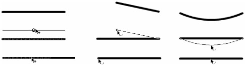 Figure 5-36 shows the various Selection tool arrow states used to modify a line. The lower images show the arrow state cursors, the center images show the preview as the mouse is dragged, and the top images show the resulting changes to the line when the mouse is released. You will notice that lines have to be selected in order to be moved without changing their shape with the Selection tool. If the line is not selected, the arrow only displays Reshape Corner or Reshape Curve states. If you want to add an angle to a line rather than add a curve, switch from Reshape Curve to Add Corner Point by holding down the Alt (or Option) key before clicking and dragging a line segment.