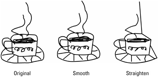 The Smooth and Straighten options available with the Selection tool (when a raw shape or Drawing Object is selected) are best used to clean up drawings by smoothing irregular curves or straightening crooked lines. Smoothing or Straightening reduces the number of bumps and variations (or points of transition) in a complex shape or line by reducing the number of points. The simplest curve or line will only be described by one point at each end.