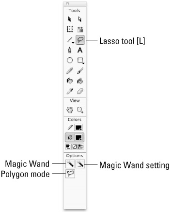The Lasso (L) is a flexible tool, somewhat resembling the selection equivalent of the Pen tool crossed with the Pencil tool. You use the Lasso primarily to make freeform selections and to group-select odd or irregular-shaped areas of your drawing. After areas are selected, they can be moved, scaled, rotated, or reshaped as a single unit. You can also use the Lasso tool to split shapes, or select portions of a line or a shape. As shown in Figure 5-39, it has three options in the Tools panel: the Polygon mode button, the Magic Wand, and the Magic Wand properties.