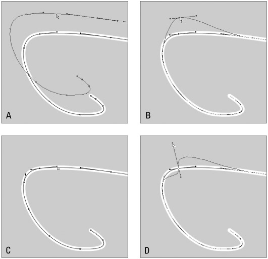 Figure 5-41 shows the use of the Subselection tool to move a path (A), to move a single point (B), to select a tangent handle (C), and to modify a curve by adjusting its tangent handle (D). Note that a preview is shown before releasing the handle.