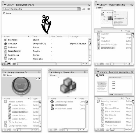 Flash ships with three External Libraries called Common Libraries. These panels hold readymade elements that you can drag into any document Library (or onto the Stage or Pasteboard in an open Document Window) to use in your own projects. Common Libraries behave exactly like any other External Library. Choose Window ð Common Libraries to open the submenu of Common Libraries that ship with Flash. The Buttons and Learning Interactions Libraries contain a selection of prebuilt Flash elements that you can reuse in any Flash project. The Classes Library contains compiled scripts that are used with the components that ship with Flash 8. Macromedia stores these elements in the Classes Library as Compiled Clips to encapsulate the code.