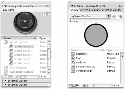 External Libraries are panels that open separately from the main Library panel to provide access to stored assets for files that are not currently open in the Document window. You can open any saved Flash file as an External Library by choosing File ð Import ð Open External Library and browsing to the file that you want to load. All the stored symbols from your selected file will be visible in a floating External Library panel, but the document will not be visible in the Document window and you cannot edit the symbols in the External Library unless you copy them to the main Library panel or to the Stage of a file that is open in the Document window.