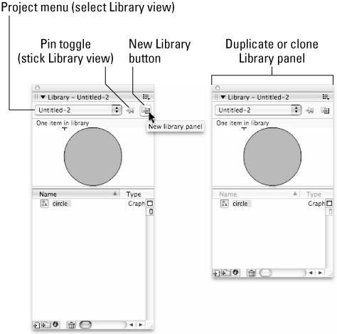 There are times when you may want to see the contents of more than one Library at a time — to compare files or to drag items from one Library to another. Fortunately, Macromedia included a handy button in the Library panel that supports this workflow. Click the New library panel button (shown in Figure 6-3) to create a duplicate floating Library panel at any time. You can then use the drop-down menu to switch the project view in one of the Library panels to compare items or to drag the contents of one Library to another. Like External Libraries or other floating panels, Document Library panels can be grouped (for tabbed access), stacked, or floated as individual panels.