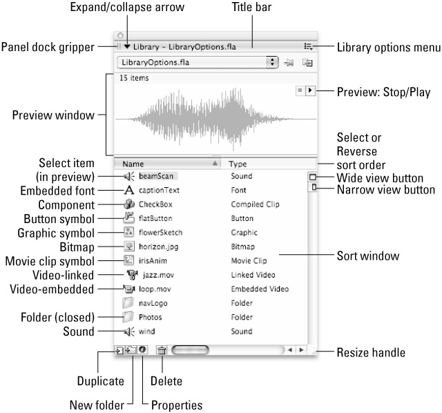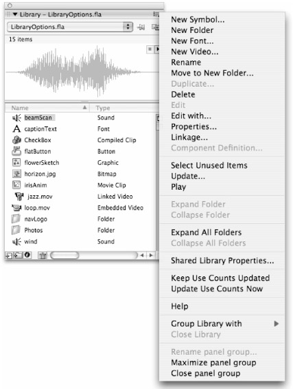 If the item selected in the Library is a Button symbol, a Movie Clip, or a sound file with more than one frame on its timeline, a controller appears in the upper-right corner of the Preview window. This Preview Stop/Play controller pops up to facilitate previewing these items. It's equivalent to the Play command in the options menu. As shown in Figure 6-5, the Library options pop-up menu lists a number of features, functions, and controls for organizing and working with items in the Library.