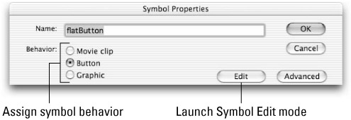 Selecting New Symbol, Duplicate, or Properties from the options menu launches the Symbol Properties dialog box, shown in Figure 6-6. Use this dialog box to give the symbol a unique name and assign it a behavior (as a symbol type — Graphic, Button, or Movie Clip). However, if you choose the Properties option for a sound asset, then the Sound Properties dialog box appears.