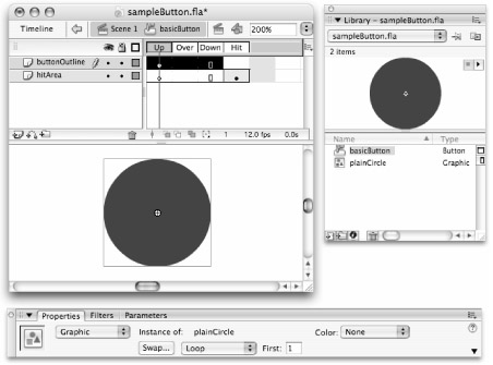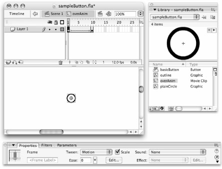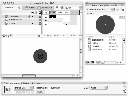 To demonstrate building an animated Flash movie from various symbol types, we made a Button symbol called basicButton that uses some raw shapes, some Graphic symbols, and some Movie Clips, all nested inside a Button symbol timeline.