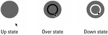 Test your animated button again (z+Return or Ctrl+Enter) and you will see that the animation now appears when you click the button. But instead of the original black that appears on the Over state, the animation for the Down (click) state is white. The three visible states of your button should now resemble Figure 6-16.