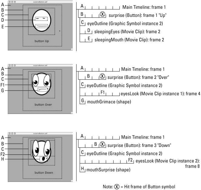 If you would like to deconstruct another layered symbol structure, we have included a silly, but slightly more complex, animated Button on this book's CD-ROM. You will find the source file, surpriseButton.fla, in the ch06 folder. Figure 6-17 shows the three visible button states and diagrams the basic symbol nesting. |