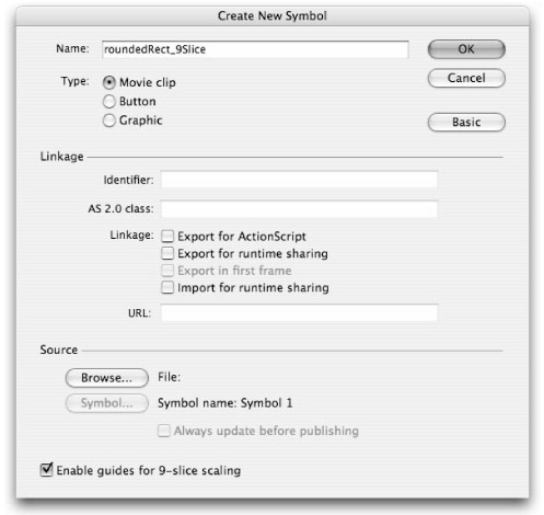 If you create a Movie Clip with artwork first and then enable 9-slice scaling by accessing the Symbol Properties dialog box from the Library, the slice guides will automatically be aligned to the outside edges of your artwork. You may still need to adjust the guides to get the exact result that you want, but the starting point will be much closer than it will be if you enable the 9-slice scaling guides before you create the artwork. |