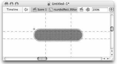 Once you have your graphic sized and aligned as you would like it, click and drag the guides to position them so that the curved areas of your graphic will not be distorted when the scaled instance is rendered in the .swf. This is difficult to describe with text, but Figure 6-19 shows a centered rectangle with guides positioned to protect the rounded corners of the rectangle while allowing the center area of the graphic to be stretched when the symbol instance is scaled.
