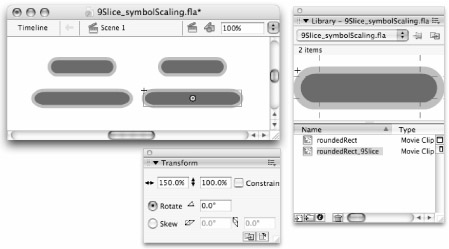The difference between 9-slice scaling and normal scaling is only visible in the published .swf. When you publish or test your movie (as shown in Figure 6-21), you'll see that the symbol without 9-slice scaling (left) is distorted when it's scaled larger while the symbol with 9-slice scaling enabled (right) scales gracefully and preserves the original shape of the rounded corners.