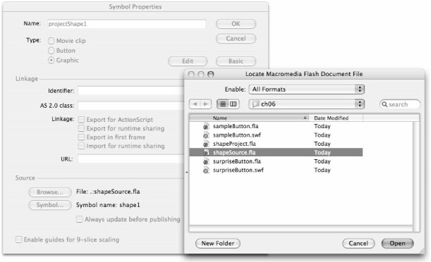 Choose Properties from the contextual menu or from the Library options menu and under Source in the Symbol Properties dialog box, click the Browse button to find the .fla file that contains the symbol you want to use as a source. After you find the .fla that will be your source, select it in the file list and click the Open button (as shown in Figure 6-25).