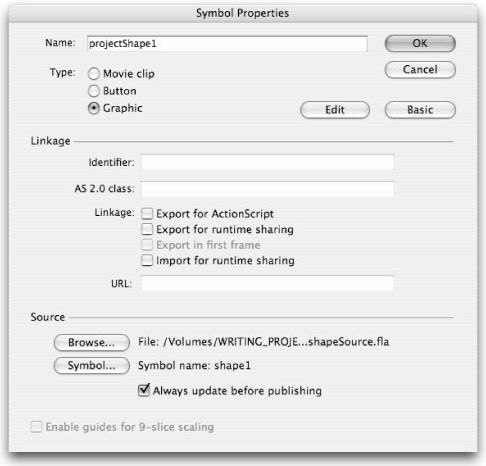We have included two sample files with some basic symbols that you can use to try out the symbol-linking feature. Both shapeProject.fla and shapeSource.fla are in the ch06 folder on this book's CD-ROM. |