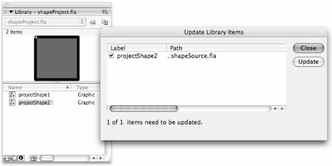 Should any changes be made to the content of the symbol in the source .fla, you can either publish an .swf from the project file to see Flash automatically check for changes and update all linked symbols (with the Always update before publishing check box selected in the Symbol Properties dialog box), or you can use the Update command to manually get the most recent version of the symbol into your project file before you publish an .swf. To see how this works, follow these steps: