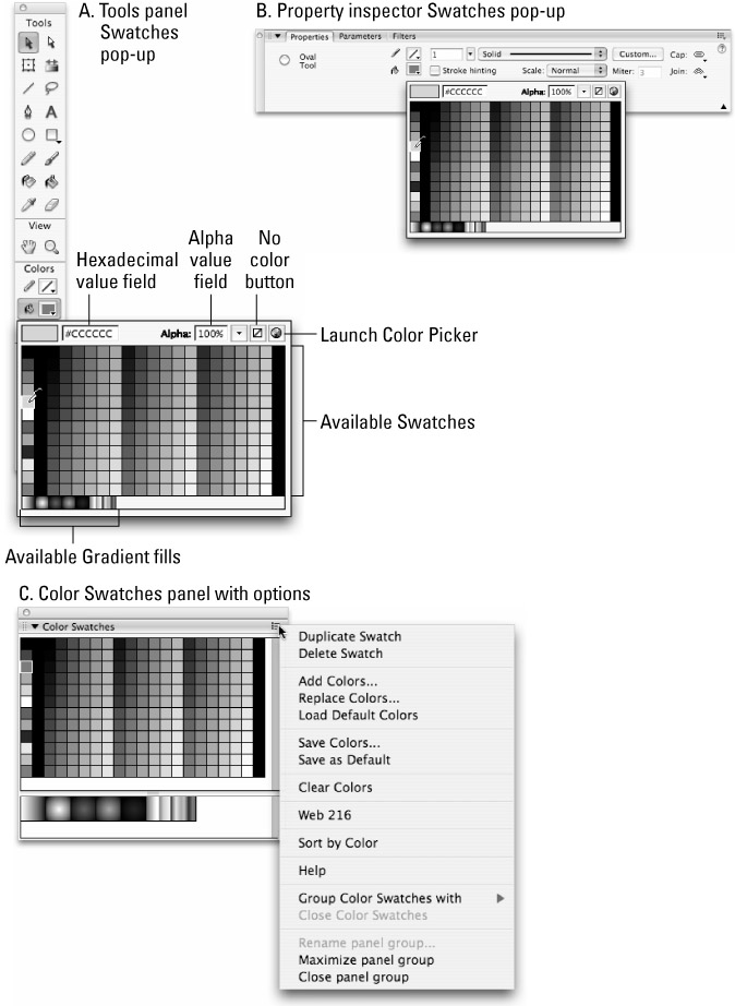 The Color Swatches panel (Ctrl+F9 or z+F9) is the most commonly used source for selecting colors as you work in Flash. Although the controls for loading or modifying specific palettes are available only on the main Color Swatches panel, both the Tools panel and the Property inspector give you quick pop-up menus to access whatever colors are currently loaded. If the main Color Swatches panel isn't visible, you can always find it in the application menu under Window ð Color Swatches. Figure 7-6 shows the Fill Swatches for the default Web 216 colors as they display in the pop-up menu in the Tools panel (A), the Property inspector (B), and on the main Color Swatches panel (C). The Color Swatches panel is shown with the Options menu that is invoked by clicking the top-right corner of the panel.