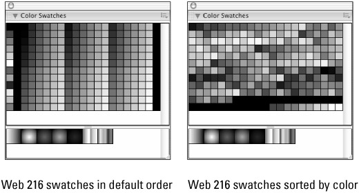 Sort by Color: This organizes the swatches by hue rather than by mathematical number and can visually be a more logical way to find colors in your current set. Note, however, that once you apply this sort, you have no way to toggle back to your original swatch order (other than reloading the default Web 216 swatch set). So it is best to save any custom palette first before sorting so that you have the option of going back to the other display if you prefer it. Figure 7-7 shows the Web 216 palette as it appears sorted numerically (left) and as it appears sorted by hue (right).