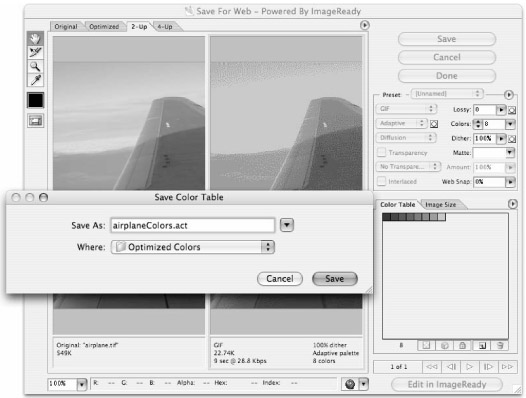 When you have a set of swatches that you are happy with, choose Save Color Table from the Color Table options menu. The settings used for the sample file are shown in Figure 7-9.