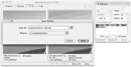 Give the Color Table a name that you will remember (such as airplaneColors) and save the .act file to a folder where you can find it again. Creating a Custom Palettes folder on your system, where you can store and organize any of the Color Tables or source GIFs that you may want to use again, is a good idea.