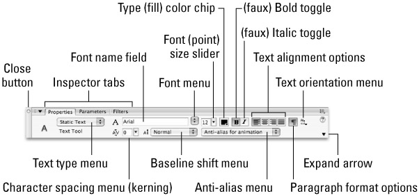 Figure 8-1 shows the basic controls that appear in the collapsed Property inspector when the Text tool is selected from the Tools panel.