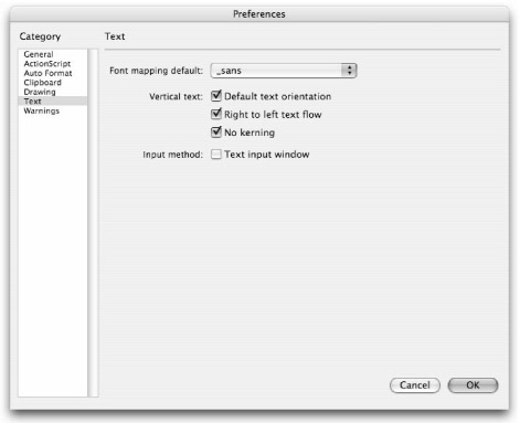 Although the default orientation for text in Flash is horizontal and left to right, you can modify the Vertical text settings in the Text category of the Flash Preferences dialog box, as shown in Figure 8-4 (File ð Preferences or, in OS X, Flash ð Preferences). To make all new Static text boxes automatically orient vertically, select the Default text orientation check box. To change the default text flow, select the Right to left text flow check box. You also have the option of disabling kerning on vertical text by selecting the No kerning check box.