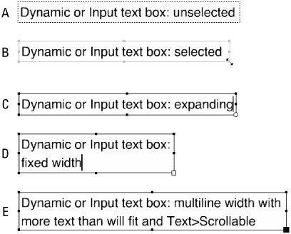 You can author Dynamic text horizontally in expanding or fixed-width fields, but you cannot rotate or modify it with the Vertical text option. Figure 8-5 shows how a Dynamic or Input text field will display when it's unselected (A) and how the field type is indicated by the handle icons when the text is double-clicked. If you plan to work with multiline text fields, but you have limited space for the text, you can set the text field behavior to scrollable in the Text menu (Text ð Scrollable); this enables the text to extend outside the visible area of the text box.