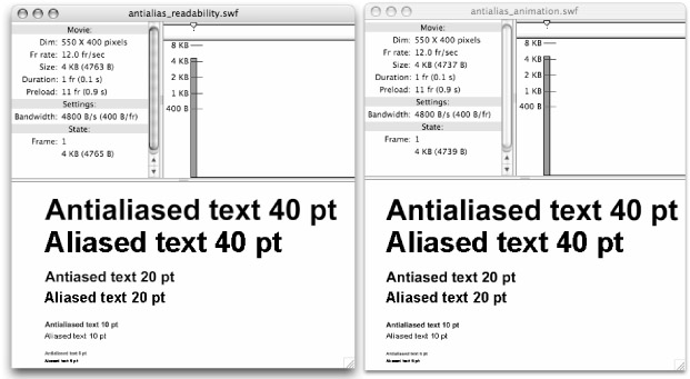 Figure 8-15 compares aliased with anti-aliased text in two published .swfs: one with Anti-alias for readability applied (left) and one with Anti-alias for animation applied (right).