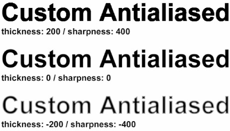 The settings ranges for thickness and for sharpness are different, but for both, "normal" is 0. Select a higher number to increase the level of the effect and choose a lower number to decrease or reverse the effect. Figure 8-17 illustrates "high," "normal," and "negative" combined settings, but these settings are really only meaningful if you adjust them individually and observe the results on your own specific font sample.