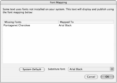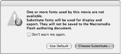 If Flash cannot find font information on your machine to match what is specified in a file (.fla) when you open it in the authoring environment, you will be notified by the Missing Fonts alert box (shown in Figure 8-18), and prompted to select fonts installed on your system to substitute for display.
