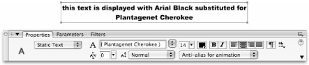 Even though the text is displayed in a substitute font, Flash includes the name of the missing font in the Property inspector font menu (see Figure 8-20). Flash preserves the original font specification when the file is saved so that the text displays correctly when the document (.fla) is opened on a system with the missing fonts installed. You can even apply the missing font to new text by selecting it from the font menu in the Property inspector.