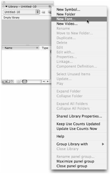 Font symbols can be integrated in your workflow in two ways. If you plan to use Font symbols within a Flash document (.fla) simply as a way to make edits faster in that one document, and you don't mind exporting the font information with every .swf, you can create a Font symbol directly in the main Library of your current document and rely on author-time sharing to update instances of the font. However, if you want to save file size by linking to the Font symbol information for runtime sharing, you should open a new Flash document before creating your Font symbols. In either case, the initial steps for creating a Flash Font symbol are the same: