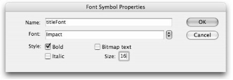 The Font Symbol Properties dialog box appears so that you can enter a name for your Font symbol and select the font you want to embed in the file (see Figure 8-24). The name that you enter shouldn't be the same as the original font name but rather should indicate how the font is being used in your project. For example, if you are using an Impact font for your titles, instead of naming the Font symbol "Impact," you could name it "titleFont" or some other name that will inform you (and the rest of your team) how the font is being used.