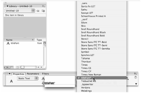 The next step required to use the Font symbol in your project depends on how you choose to integrate Font symbols into your workflow. As we mentioned earlier in this chapter, using symbols for author-time asset sharing can make it easier to propagate changes throughout a document, but any assets used in your document will still be embedded in each movie (.swf) that you publish. Creating a separate library for storing symbols and linking these as runtime shared assets in multiple movies takes a little more work, but it gives you the benefit of both streamlined updates and smaller file sizes. The most appropriate workflow depends on the scope and content of your particular project and on how willing you are to manage the risks involved with using runtime shared assets.