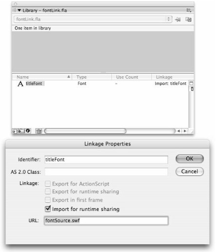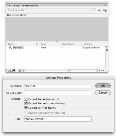 If you are planning to keep the source movie (.swf) in the same folder as your individual destination movies (.swf), then all you need to enter in the URL field of the Linkage Properties dialog box is the name of your source .swf file — in our example fontSource.swf.
