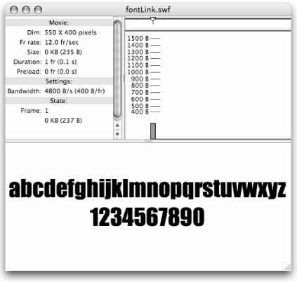 When a Font symbol in your Library has the identifier and URL entered in its Linkage properties, you can use the linked font in your document by selecting it from your font menu and using the Text tool as you normally would. When you publish your movie (.swf), you will notice that your file size is much smaller than it would be with embedded font information. For an example of this, compare the file size listed in the Bandwidth Profiler shown in Figure 8-29 (linked = 235 B), with Figure 8-30 (embedded = 4644 B).