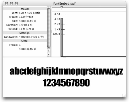Now you can save your source .fla file to the final storage location using File ð Save (Ctrl+S or z+S) and test your source .swf using Control ð Test Movie (Ctrl+Enter or z+Return). Although nothing is displayed in the published .swf, if you turn on the Bandwidth Profiler (from the application menu: View ð Bandwidth Profiler, or with shortcut keys Ctrl+B or z+B), you will see the size of the font information for all of the embedded characters included in your Font symbol. Our sample font symbol source file was 19K (see Figure 8-27).